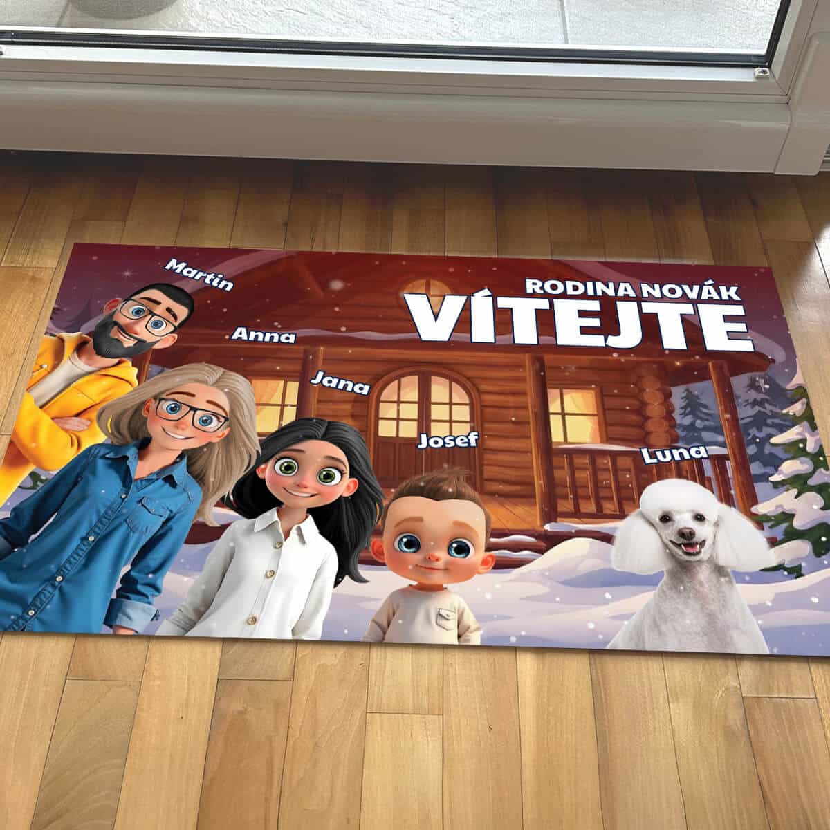 Přivítejte se doma s personalizovanou rodinnou rohožkou s rozkošnými kliparty vaší rodiny, domácích mazlíčků a dokonce i s vaším příjmením ve stylu komixu! Vyberte si ze 3 hřejivých citátů a několika barev pozadí a vytvořte si rohožku stejně jedinečnou jako vaše rodina.